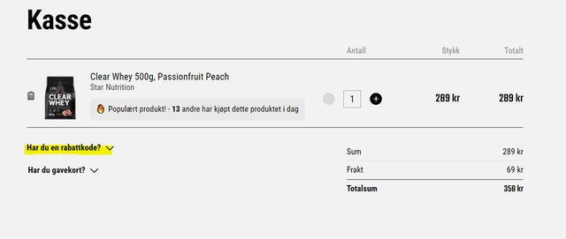 Hvordan bruker jeg en rabattkode?Sist oppdatert tor. 05. mars 2026 Rabattkoden legges til i kassen under "har du en rabattkode?" som vist på bildet over.
